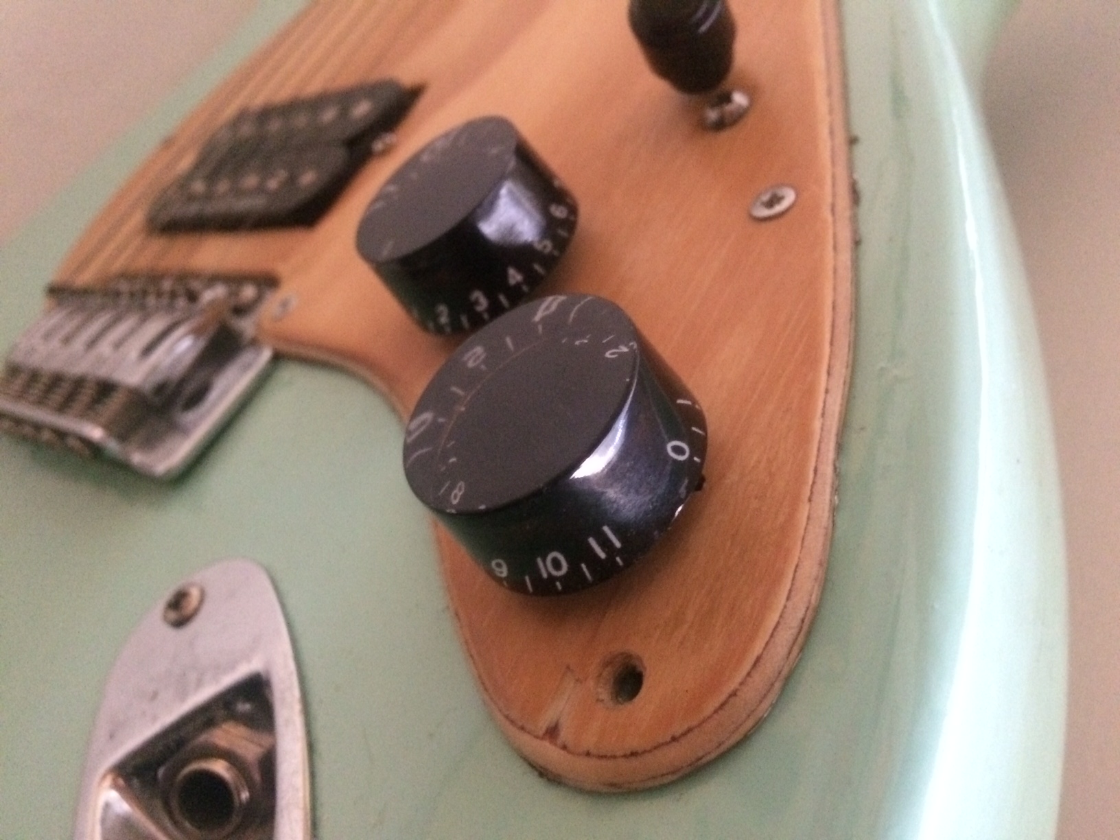 So I scrapped the three singlecoil mics. We played skatepunk, so I painted it in surf blue, or whatever the color was called (doesn’t look too good close up), made my own custom pickguard and changed the mics. I can’t remember what kind of Seymour Duncan they are, but the bridge one is for the fast paced parts, sounds hard and sharp. The neck one sound extremely good, deep, full, clear, when used with clean sound. The mic switch is changed to a 3-way, neck-both-bridge, full tone always. The knobs are volume for each mic.