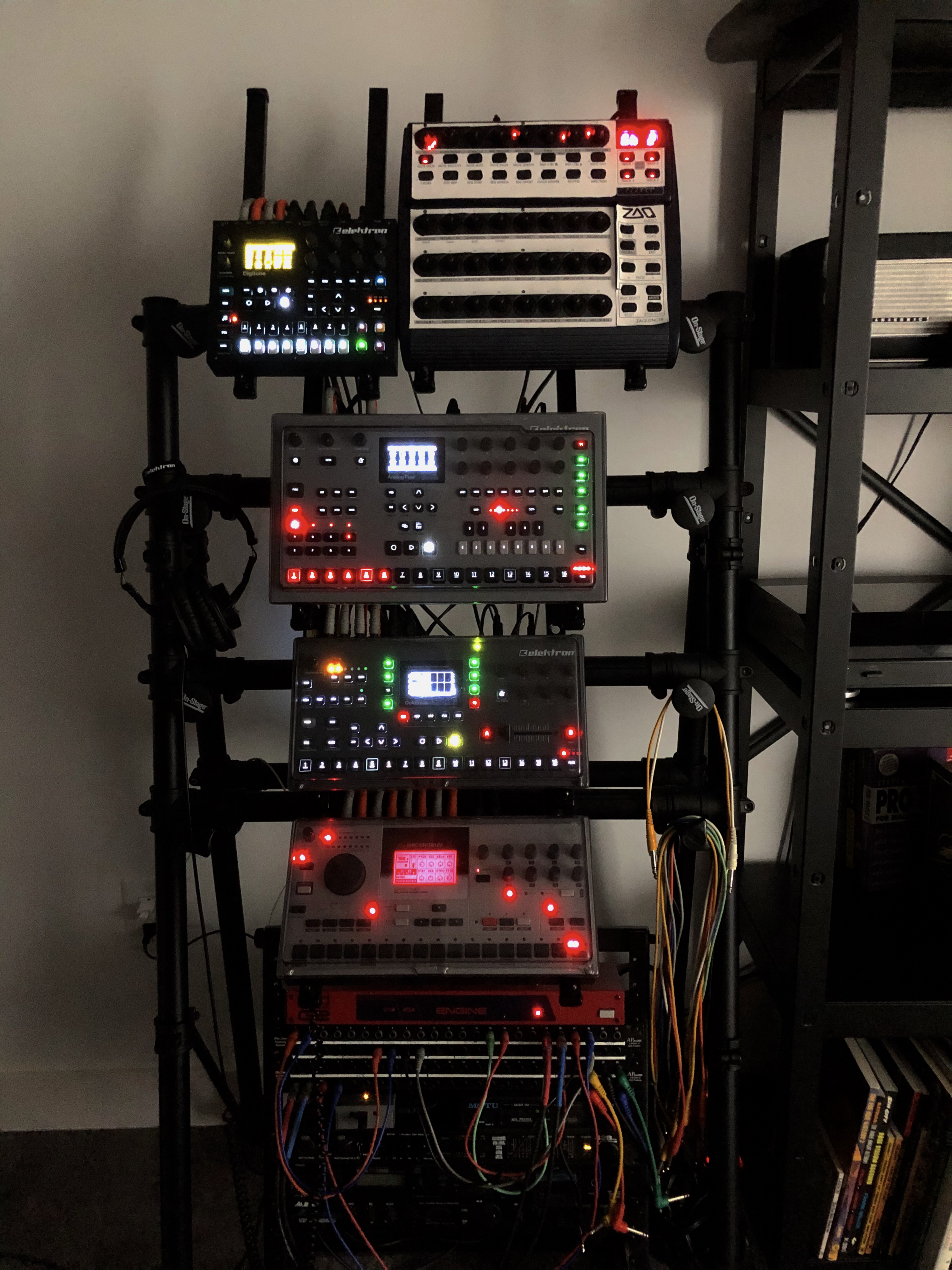 I promised an update on my setup when my patch bay came in and it arrived this morning. Just finished making sure everything still makes sounds after wiring it up. And I rarely turn everything on and won’t be keeping the Rev2 for long so I took the opportunity to show off the whole lightshow in the dark.