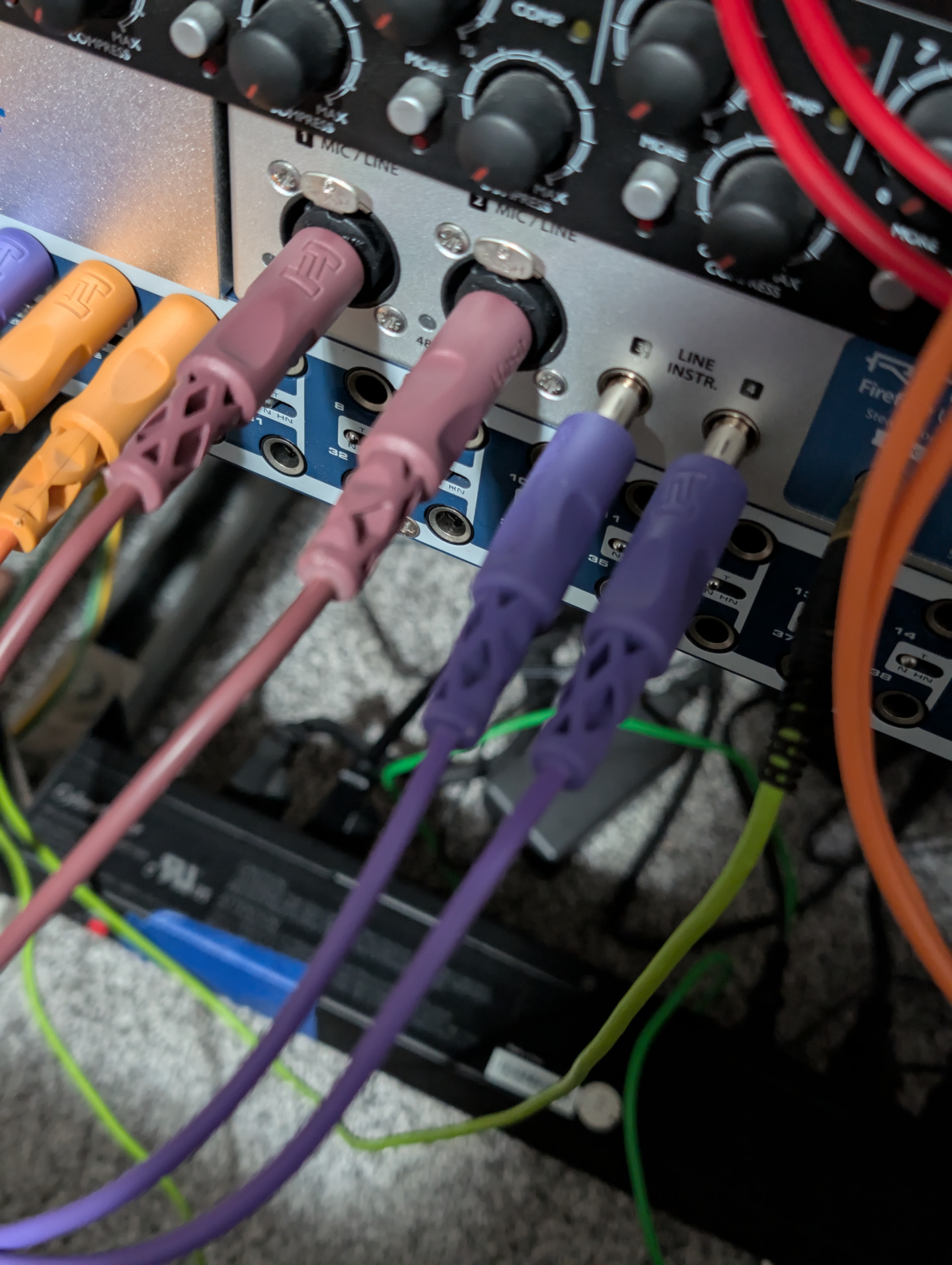 Ok, found two noise issues tonight, but both only seem to enter my interface through inputs 3 and 4, my Osmose. Not coming from the Osmose, but those purple cables on the patchbay that pass to the front inputs 3 and 4. The first is my laptop PSU. Use my laptop on battery with USB and it’s noise free. Plugged in it sounds like the start of a harsh noise track. My laptop lasts about 40 minutes on battery without being plugged in….