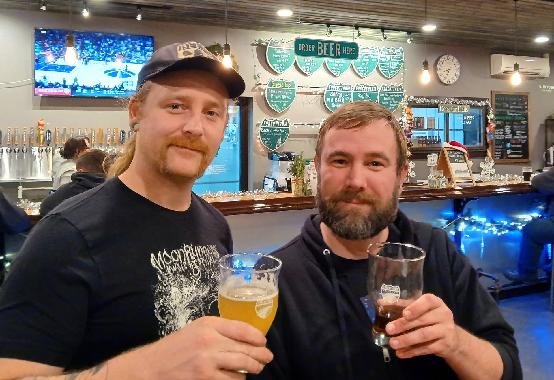 Myself and an old friend at the local microbrewery before it closes. 'Twas my favorite place to have a beer.