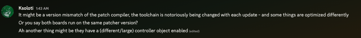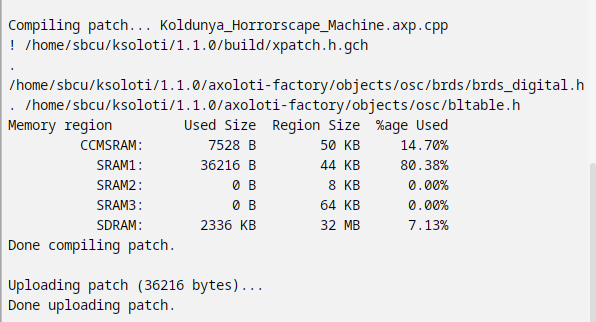 It’s off on mine. I’m really convinced this is a mismatch between using the old Axoloti github stuff vs the Ksoloti, probably the toolchain/compiler like he mentioned. I think it’s basically the same code but improvements in both the src and the compiler options have made it a tad bit smaller in the intervening years. I may look at getting things running with the Ksoloti packages, though I’m not seeing a ton of info on how to do it so it’ll take some playing around.