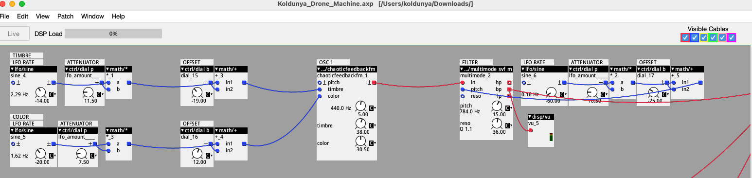I’m using VCVRack when I’m away from an Axoloti while keeping in mind the constraints of the Patcher software’s implementation of say, Braids. There is no Modulation amount knob to access/control for Axoloti, for example. It’s giving me a lot of ideas on ways to implement a so-called “drone engine” (term that guy used in the above video).
