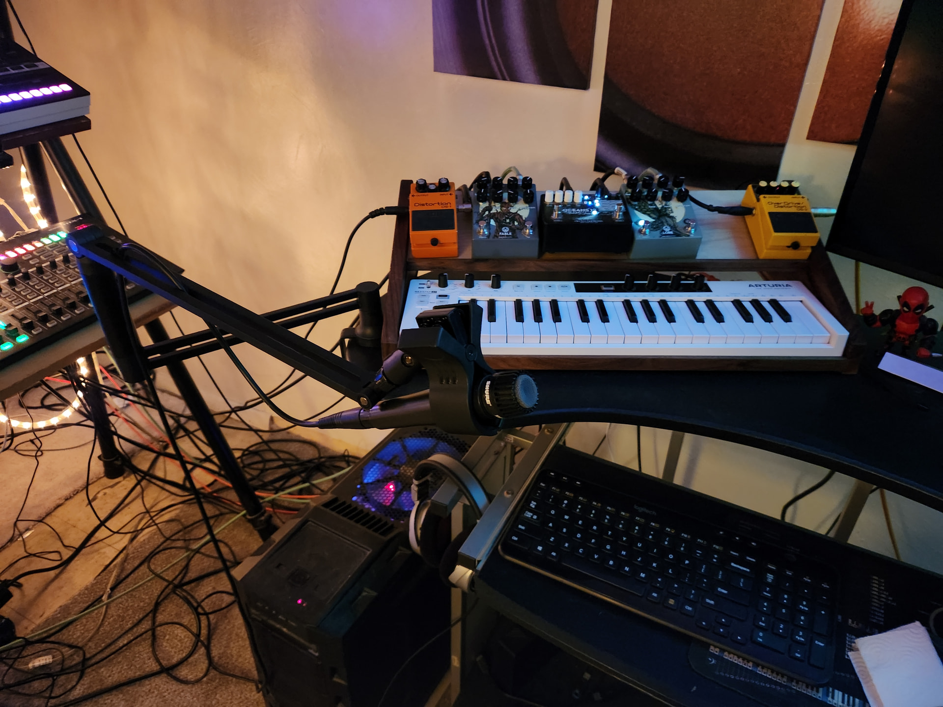 Got a couple more things for the project studio. A preamp, desktop swivel boom, and a rack that holds my keystep and pedals.