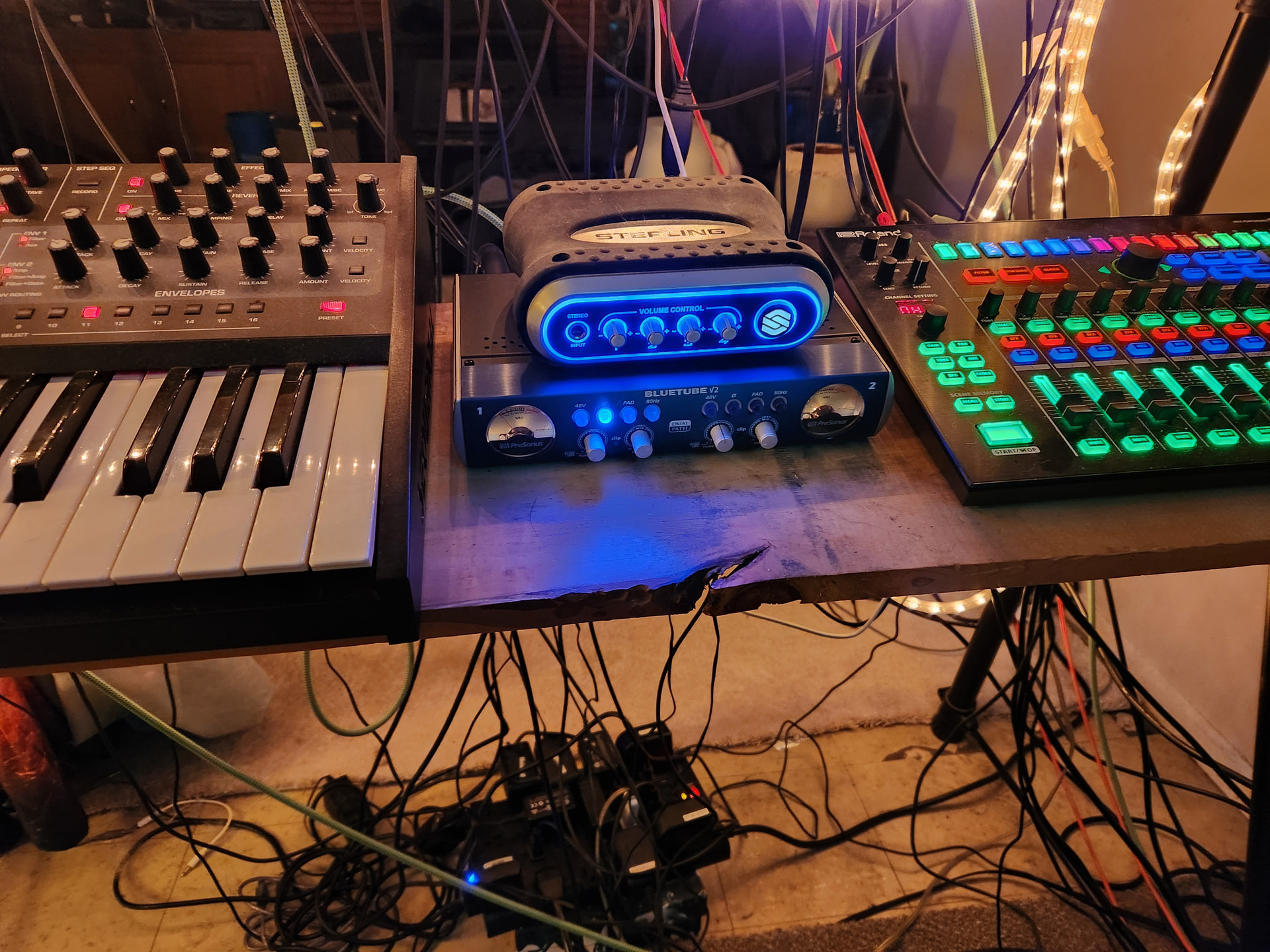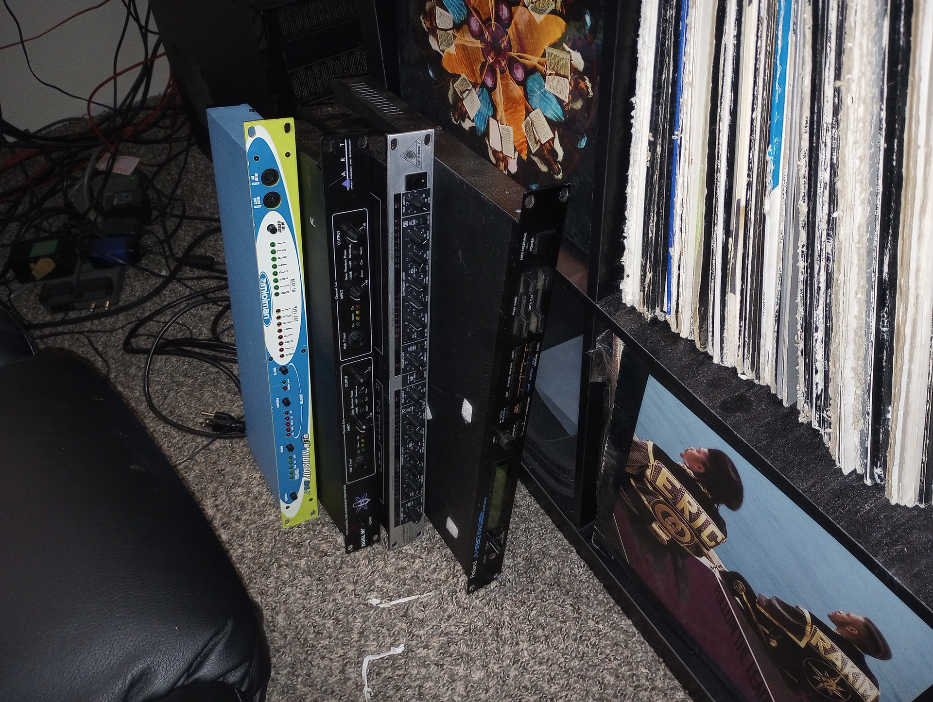 Bought a JV880 back in May. My middle daughter came out back in June and while she was here she wanted to record a demo of her singing for a job. Realized I don’t really have an outboard mic pre or compressor outside of the stuff built into my little Behringer Xenyx Q802USB mixer, so I nabbed an Art Dual MP and Behringer Composer (yes, I have plenty of VST’s for compression/limiting but I honestly didn’t think of them until after we finished recording for the night). None of these have been added to the signal chain or even powered up aside from the JV briefly. In fact, they’re all leaning against the stand with my vinyl and turntable along with an 8x8 MDI interface I picked up over the summer.