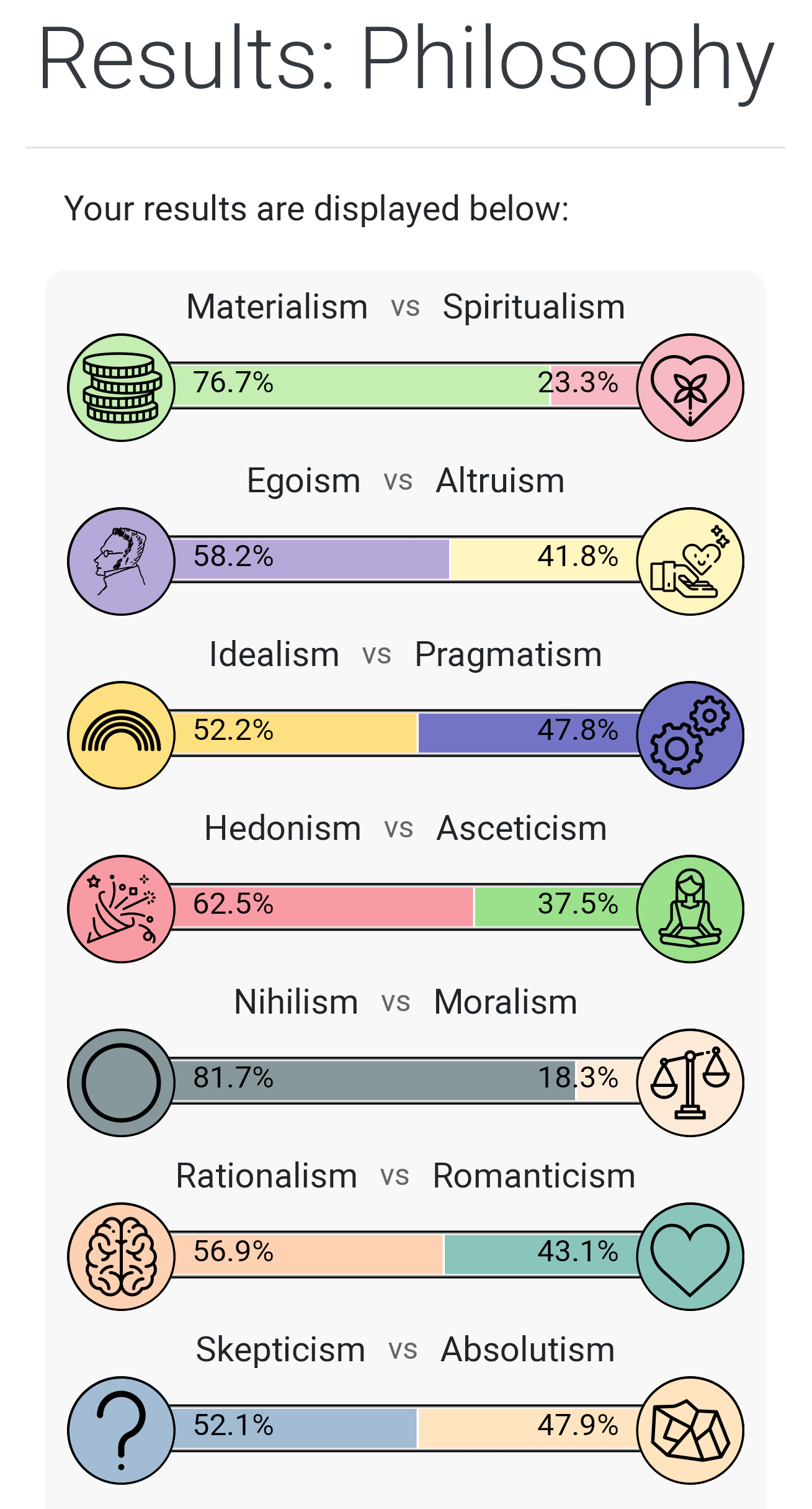 I kinda disagree with most of the dichotomies in the displayed results. The opposite of materialism is not necessarily spiritual, there are things like egoistic altruism and altruistic egoism, pragmatism can be based on idealistic foundations and so on… and I don’t like the questions. Imho the test kinda compares to philosophy like a “Are you in a good relationship? Answer these 50 questions and find out!” test compares to love. Not saying it can’t be fun, just playing the advocatus diaboli here