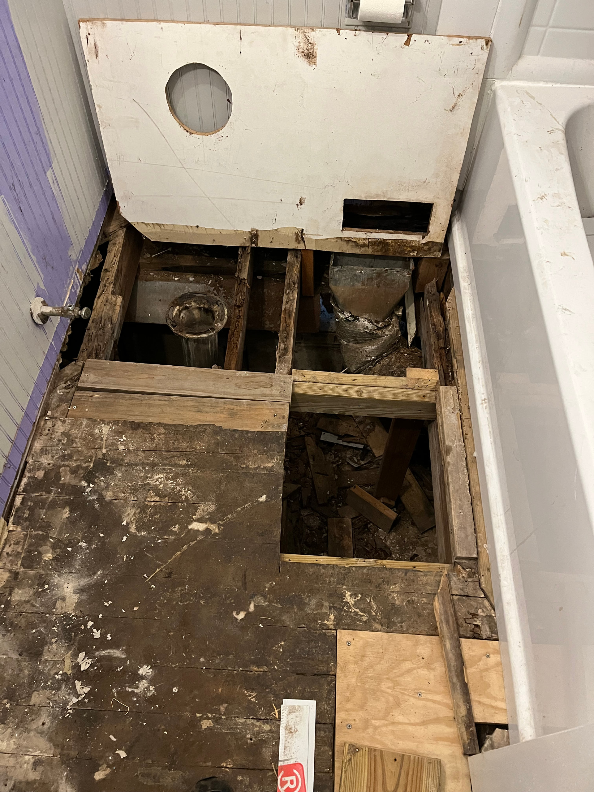 The bathroom’s always been wonky, feels like you’re falling forward when you walk towards the tub, floor just slopes down. We’re putting in new flooring and I wanted to try and get it level because it’s been patched so many times nothing is actually flat past the halfway point. So I go to taking up the patches and find the cracked drain and a bunch of rotten joists (I’m sure from having shitwater burbling for a decade or more).